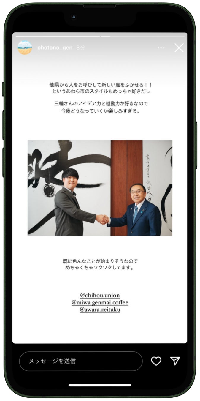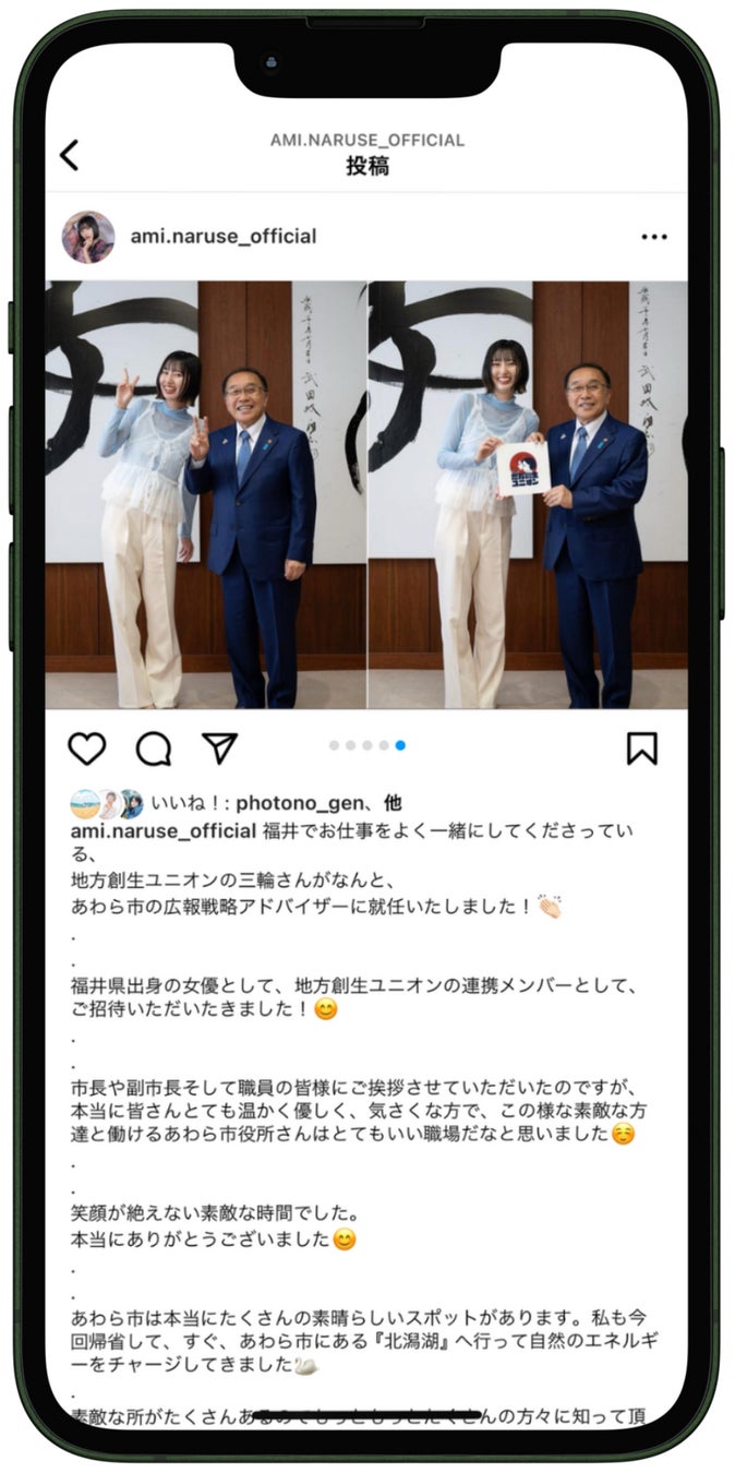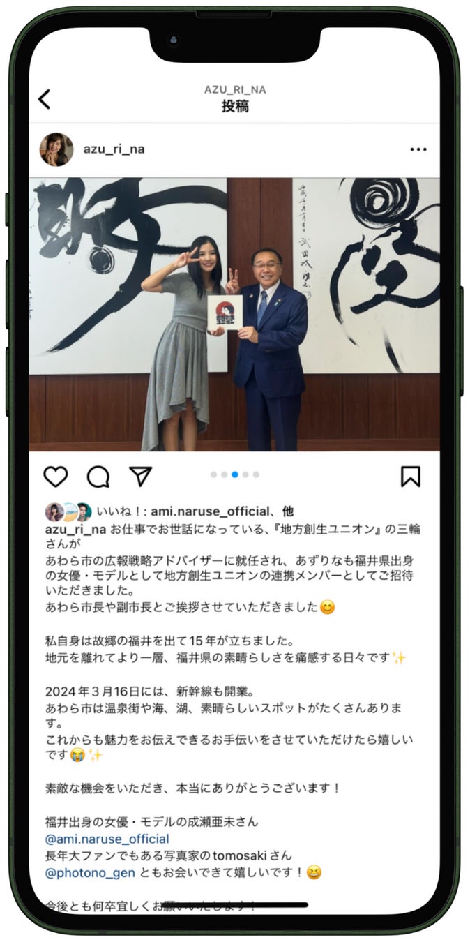 地方創生ユニオンと連携し、総フォロワー数60万人を超える福井県出身のインフルエンサーが来庁し、委嘱状交付式に出席しました。その様子とあわら市の魅力をInstagramで発信していただきました。